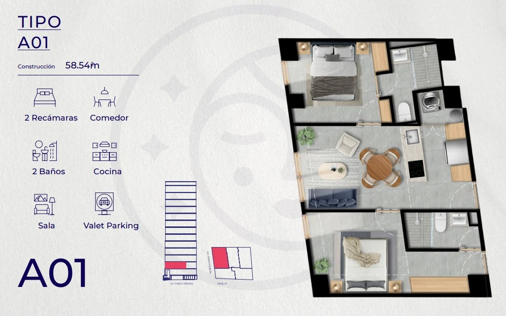 Descubre Matilde, una torre exclusiva de 12 niveles y solo 35 departamentos, diseñada especialmente para ejecutivos y turistas que visitan Guadalajara por estancias cortas o medias, con un enfoque práctico, moderno y con una ubicación privilegiada.